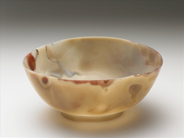 瑪瑙質,器黃灰色,間有紅、灰色斑點。器作四瓣海棠花形,深壁矮圈足,圈足內刻有「乾隆年製」四字篆款。