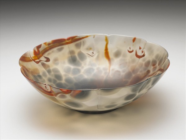 瑪瑙質,灰色,有黑、紅色斑。器作九瓣花形,侈口矮圈足,器壁灰濁微透,全器光素無紋。