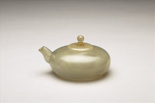 瑪瑙質,黃灰色,半透明。器身如饅頭而稍矮,小口碩腹,底微凹入,有一短流,全器光素無紋,底有「雍正年製」四字篆款。