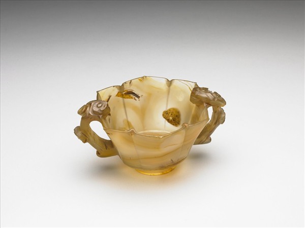 瑪瑙質,玳瑁色,有黃、黑斑。侈口深壁,矮圈足。器口作一盛開的六瓣花形,每枚花瓣中央微帶尖凸,二器柄琢成帶莖靈芝形。