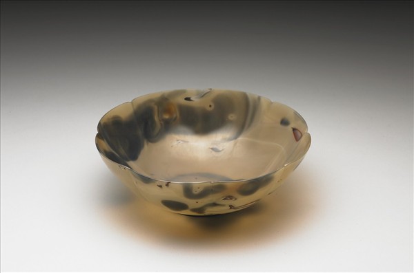 瑪瑙質,灰黃色,間雜黑、紅色斑,黃濁略透。器作盛開的八瓣花形,侈口矮圈足,全器光素無紋。圈足內琢「乾隆年製」四字篆款。