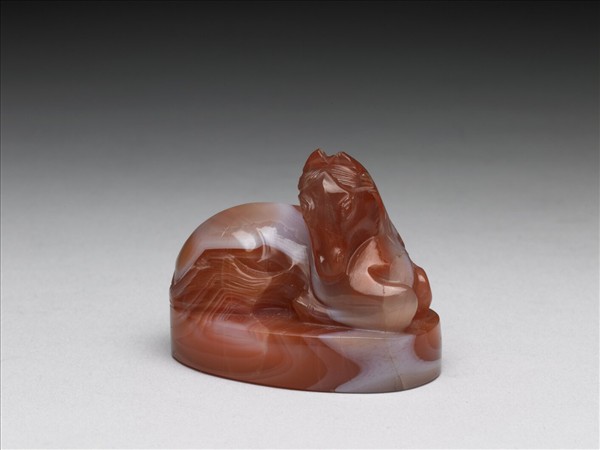 瑪瑙質,呈磚紅色,有乳白色斑紋。橢圓形,高浮雕一匹馬作鈕,馬背上刻一「*」字符號。圖章作徵信之用。與另外五件未刻圖章同儲於木盒中。