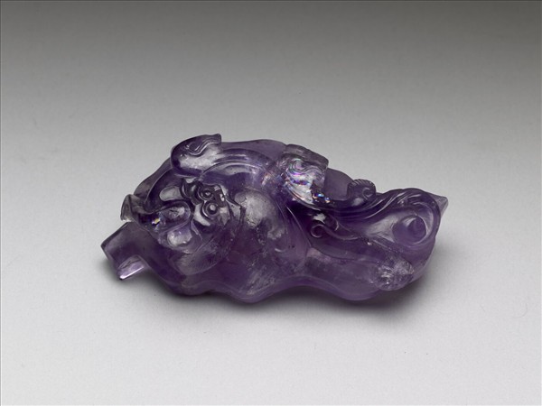 水晶質,呈紫色。一片葉形,高浮雕一螭為鈕。與另外五件未刻圖章同儲於木盒中。