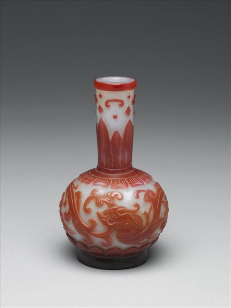 此花插以白色料為底,套以紅色料。口沿一圈折邊,直長頸,圓腹,有圈足。頸琢蕉葉紋等,腹琢龍鳳紋,下緣飾蓮瓣紋一周。底刻「大清乾隆年製 來」款。與另一件料花插成對。
