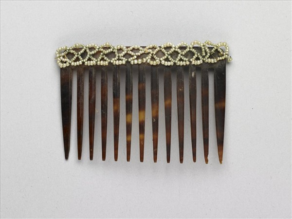 玳瑁質,呈淡、深棕色雜斑。雕成十一齒的小梳,正面上方有小珠串繞飾。一組共六件。