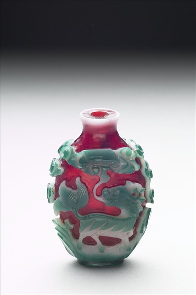 玻璃,通體紅色半透明,套以白與綠色紋飾。器略作扁圓形小瓶,唇口,短頸,豐肩,深腹下斂。器身分飾麒麟口吐祥雲、書籍,襯以山石;鯉魚吐璧,襯以波濤,紋飾精細華麗。無蓋,僅存牙製小匙。