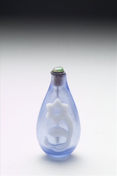 玻璃,通體淺藍色半透明,套以白色紋飾。器略扁圓形小瓶,平口,短頸,斜肩,垂腹。器身二面各一朵飾白色六瓣折枝花。帶銀嵌翠玉蓋與銀匙。