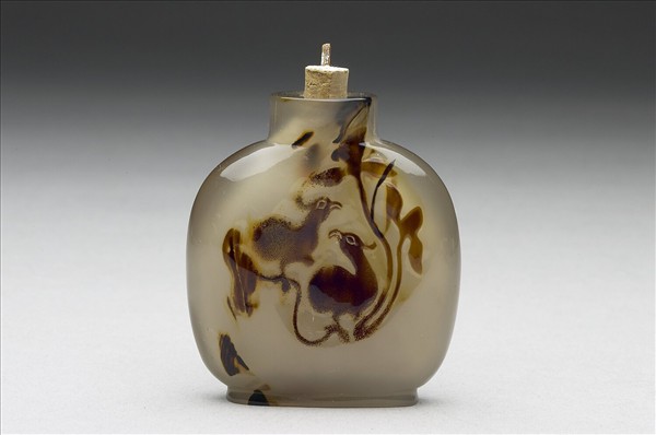 半透明淺灰色瑪瑙質,有黑棕色與黃色斑紋。器作扁圓形小瓶,平口,短頸,碩腹,淺圈足。一面光素,另一面巧妙利用原石呈色,雕二水鳥佇於荷花枝葉上,水鳥大眼彎長喙,花葉線條流動優美,極具巧思。小蓋已失,現留軟木質塞與木竹質小匙柄。