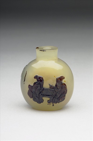 不透明乳灰色瑪瑙質,有多塊深赭色斑紋。器作扁圓形小瓶,平口,短頸,碩腹,平底。一面利用天然巧色淺浮雕二老者對弈,另一面琢二童子樹下嬉戲,樹身與蝴蝶呈深赭色。無蓋。