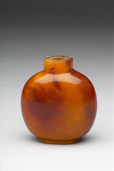 琥珀,不透明橙紅色。器作扁圓形小瓶,平口,短頸,碩腹,淺圈足。全器光素無雕紋。無蓋。