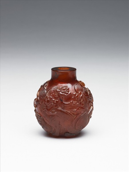 琥珀,不透明鮮紅色。器作扁圓形小瓶,平口,短頸,碩腹,淺圈足。腹淺浮雕麒麟九隻,或互相嬉戲或弄彩球,姿態各異活潑熱鬧。無蓋。