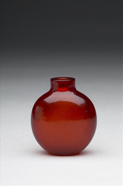 琥珀,半透明橙紅色,有金黃色光澤。器作扁圓形小瓶,平口,短頸,碩腹,平底。全器光素無雕紋。無蓋。