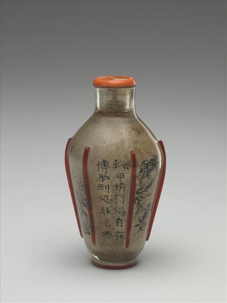 玻璃,半透明淺灰色玻璃,上有紅色與橘色套料裝飾。圓形小瓶,橘色套料小唇口,短頸,碩腹漸斂,圈足。器腹有紅色料作凸棱線六道,內壁墨繪梅花、螃蟹、仙鶴,各有詠贊一聯,內壁可見使用後留下的少許鼻煙漬跡。有珊瑚蓋,蓋上圓頂與小匙已失。