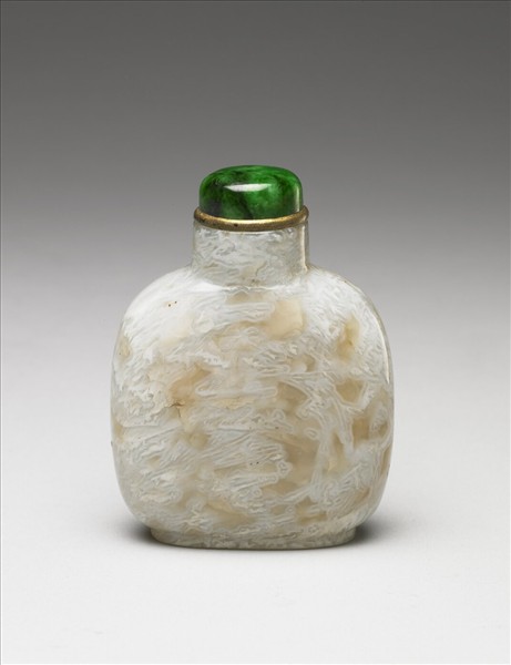 半透明淺褐灰色瑪瑙質,佈滿白色與透明線狀斑紋。器作扁圓形小瓶,平口,短頸,碩腹,淺圈足。有自然形成的結晶紋飾。附有碧玉頂銅質小蓋與骨匙。