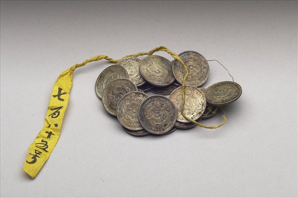 銀質,銀白色。錢幣共十八枚,每枚形制紋飾全同。幣面淺浮雕龍紋,底面有小紐,並鑄「光緒元寶」、「湖北省造」、「庫平七分二厘」字樣。附黃籤,上有墨跡書「一百八十五號」行書六字。