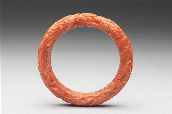 珊瑚質,淺赭紅。環狀器,器表淺浮雕雙龍穿飛於雲間,作雙龍搶珠之狀,雲氣與翻騰之雙龍滿飾全器,雕飾細緻豐富。