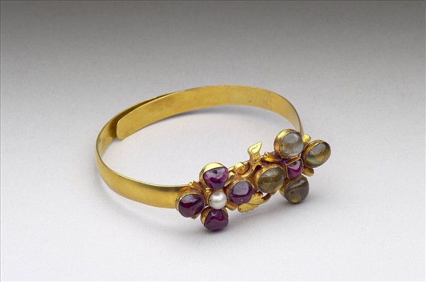 金質,金黃色。器身作片條狀,圈圍交疊成環,外徑面上鑄連折枝花,並鏤空花蕊與花瓣,鑲嵌玉石珍珠為飾。內徑面刻有「泰興足金」楷書四字。