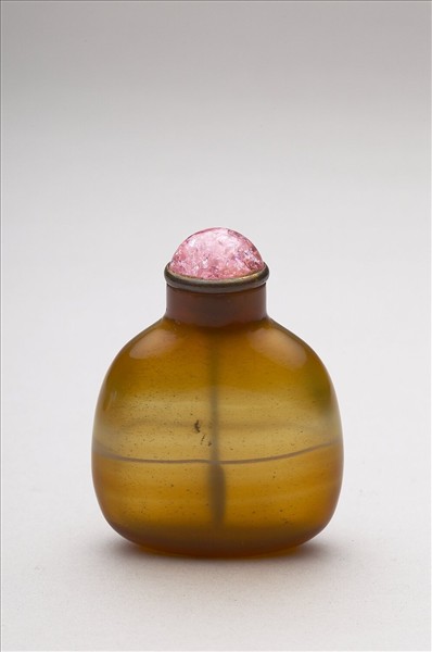 瑪瑙質,淡褐色。器作扁圓形,平口短頸,碩腹平底,器壁略透,上有灰色斑一道。蓋為粉紅色碧璽,全器光素無紋