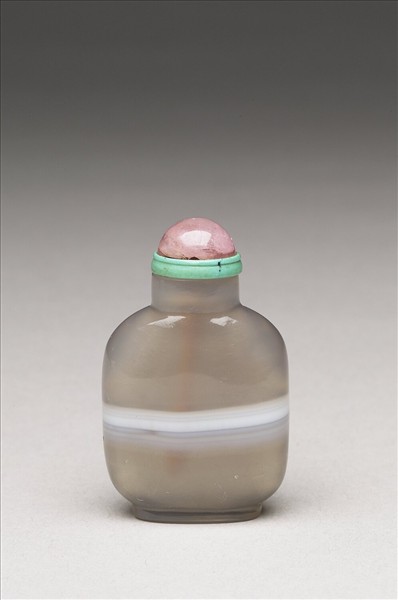 瑪瑙質,色呈灰藍,器腹圍一圈白色條紋。扁瓶形,直口,短頸,長方而圓形腹,圈足。全器光素。帶嵌碧璽綠松石蓋與小匙。