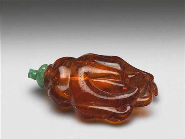 琥珀,金紅色。整器作佛手形,有天然冰裂紋,器壁略透,帶翠玉蓋,以象佛手之綠蒂。