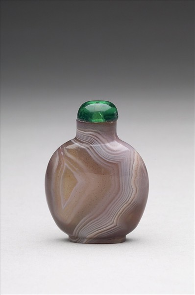 瑪瑙質,赭色,有灰白斑紋間雜其中。器作扁圓形,平口短頸,碩腹矮足,全器佈滿天然形成的幾何紋飾。器蓋為綠色玻璃料製成。
