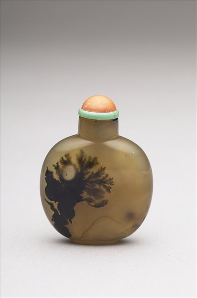 瑪瑙質,黃褐色,內有如樹木花葉紋之內繪。平口短頸,碩腹矮足。有青玉沿紅珊瑚蓋。