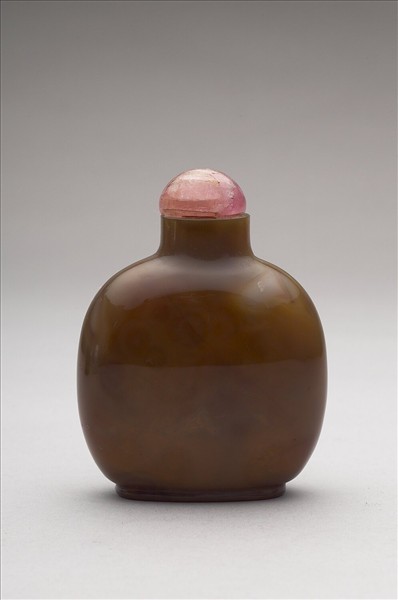瑪瑙質,深褐色,器作扁圓形。平口短頸,碩腹矮圈足,全器光素無紋。有粉紅色玉石蓋。匙尚存。