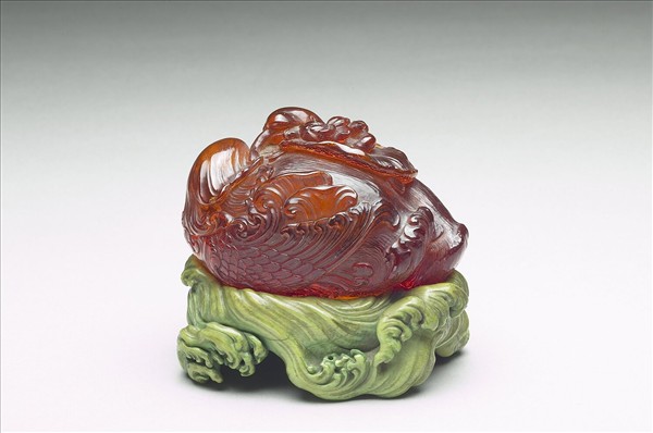 琥珀,呈蜜色。雕雙鴛鴦相偎,其中一隻口啣荷花。附綠色浪花型石座。