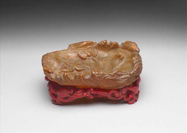 蜜臘,呈黃褐色。略呈長方形,內底淺平,洗內浮雕龍、蝙蝠、雲彩。附骨座。