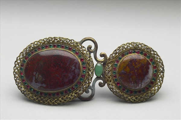 帶鉤作大小橢圓形和圓形鍍金鉤環,各鑲嵌一紅色瑪瑙,周圍綴紅綠寶石相間一圈,最外圍以金絲環纏繞,鉤上鑲飾一顆翠綠玉石,精緻華麗。固定革帶上,即可束繫腰帶。