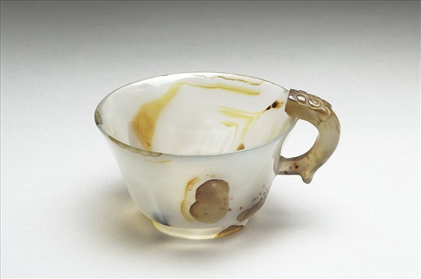 瑪瑙質,杯侈口單耳,弧形深腹,小圈足。半透明清白色底,琥珀色角狀紋理,如直筆輕撇,淡墨二三筆,勾勒茶色斑紋。耳處利用紋理顏色變化,褐色處雕琢獸面紋,頂邊雕刻鏤空。整體光素無紋,打磨薄透,晶巧溫潤。