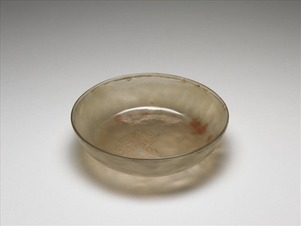 瑪瑙質,圓口淺腹,平底無款。白灰半透明底部帶有赭色小點及圓斑,置於明處底部透光,器身隱約透出卵石相疊的紋理。整體光素無紋,略帶玻璃質感,簡單大方。