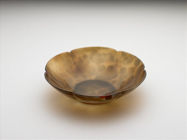 瑪瑙質,侈口,弧形斜壁,矮圈足,口沿作六瓣葵花瓣形。淺褐色半透明底,分布墨色圓斑,如豹紋斑斕;碗沿半圈紅褐色帶狀紋,帶間一塊赭色及鮮紅色斑。整體器壁極薄,光素無紋,工形內外勻整。外底鐫有「乾隆年製」四字篆書雙行款。