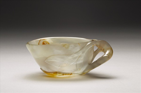 半透明灰白色瑪瑙質,並巧妙利用瑪瑙顏色變化,在褐色部分雕琢桃葉與枝。器如剖開之桃實,中空以為洗,以枝為單耳,伸出枝與葉,長枝延伸至器底成座。有海棠式杯盤。