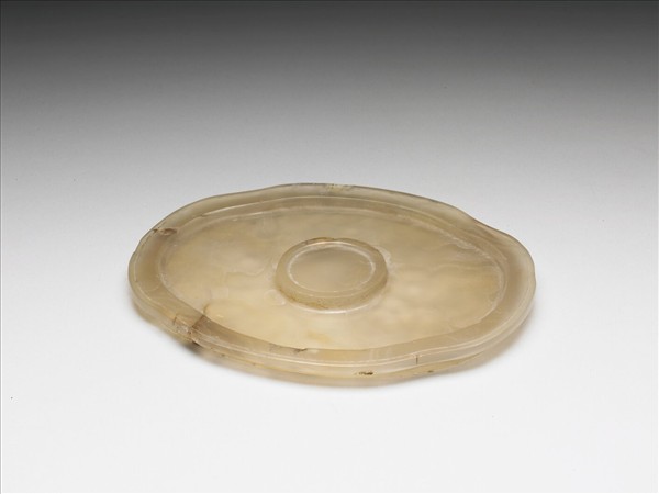 灰濁不透明瑪瑙質,有些微赭色斑點及璺。器作四瓣海棠式淺盤狀,淺壁,淺圈足,盤內凸雕一圓托,可以承杯。全器光素無紋。本件為瑪瑙碗之托器。