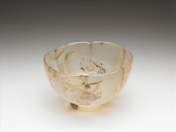 淺白色半透明瑪瑙質,有黃色帶紋及璺,及樹枝狀鐵質結晶。侈口,弧形壁,深腹,圈足,口沿作六瓣葵花瓣形,全器雕琢極薄,光素無紋。