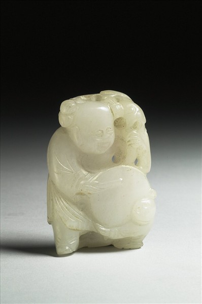 玉質。全器立雕二童,一童立姿手持靈芝,一童屈身環抱。