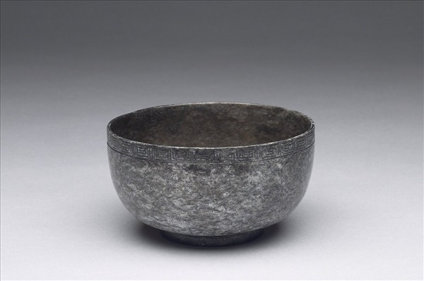 玉質。器底有璺,色黑灰。圓口、深腹、平底、圈足。口沿一圈回紋。外底有「乾隆年製」篆款。