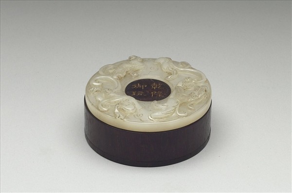 圓盒,蓋中央有圓突,刻「乾隆御玩」四字,上嵌小圓璧。內底貼鏡已氧化。盒內附玳瑁鬍鬚梳、象牙籤、耳挖、金屬銼刀及紅色護墊。壁面飾淺浮雕螭紋。