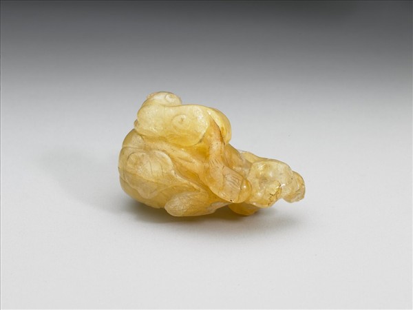 瑪瑙,色澤淺黃溫潤。全器作一大瓜形,松鼠趴伏其上,一旁並有瓜蒂藤蔓連綿小瓜。取瓜連綿生長特性「連綿不絕」、以及松鼠意寓「繁衍不息」之吉祥意義。附象牙架及木座。染綠色象牙托架,鏤雕纏枝花葉,下有紫檀木座。