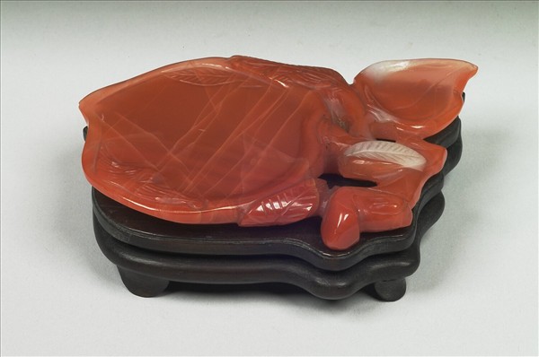 瑪瑙,色紅光潤,有璺。硯作桃果形,帶有鏤空枝葉,延伸至背面。附木座。
