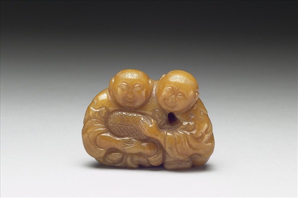 黃色瑪瑙,立雕為二並肩蹲坐童子,一作雙手合抱圓盒於胸前,另一環抱同伴,二人皆圓頭披髮,笑容可掬,嬌憨喜氣。二童子間有一對穿孔,應是將本件固定裝飾之用。和合二仙為民間吉祥俗神,有闔家或夫婦合諧之意。