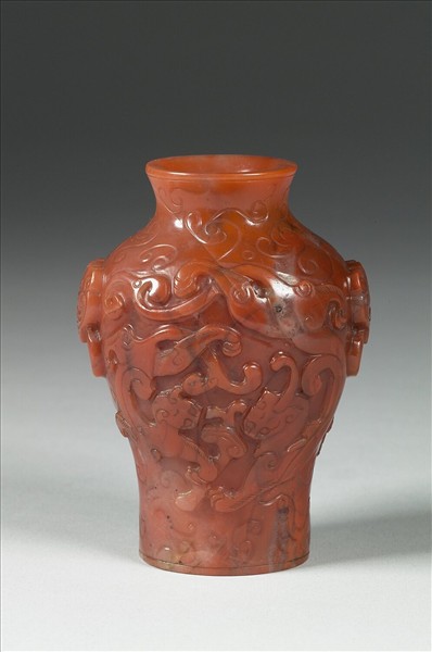 瑪瑙紋尊,色澤鮮紅光潤。短頸、斂腹,平底。器肩兩側立雕獸首銜環。腹飾浮雕雙螭獸,獸身卷曲交纏,並陰刻卷雲為地。