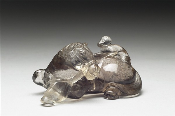髮晶,透明晶體中佈滿深灰色細絲。全器立雕一趴伏駿馬,背臀上有一小猴,馬首著轡,鬃與尾柔順細長,體態線條有勁,作踡伏休憩狀,小猴圓睛長吻,形貌稚嫩。馬與猴的組合蘊意「馬上封侯」,是常見的吉祥圖像。