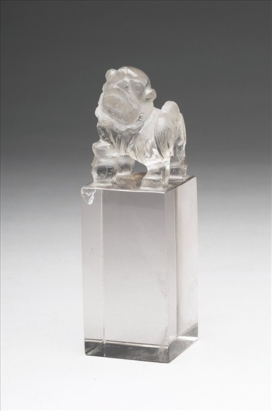 水晶,透明清澈。印鈕為一立雕獅子,瞠目咧嘴,頭頂光滑,下頷有捲毛紋飾,獸身與尾作微捲長毛狀,左前足踏一球,印面未刻。