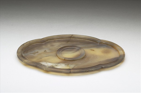 瑪瑙,色灰白不透明,色彩有雲流形變化。盤器扁平,橢圓,作四瓣形海棠花,皿中央留琢一圈圓形杯托,器底有「乾隆年製」陰刻隸款。與乾隆款瑪瑙獸耳杯成一套。