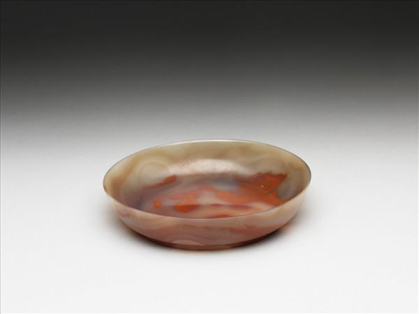 瑪瑙,不透明灰褐色,有大片鮮紅斑紋,材質溫潤。敞口,淺壁,圈足,通體光潔無紋飾,器底琢有「雍正年製」四字楷款。