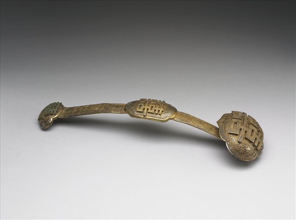 三鑲式鍍金銀如意,首趾均呈雲葉形,柄中部隆起,腹略呈橢圓形。器面滿鑄卍字不斷紋錦地,首、腹、趾各鑲一魚子地「囍」字,首面之「囍」字左右兩旁並各有一蝙蝠紋。首面周圍及柄面兩側飾蝙蝠與團壽相間紋,柄面並飾以雙蝠捧壽紋。
