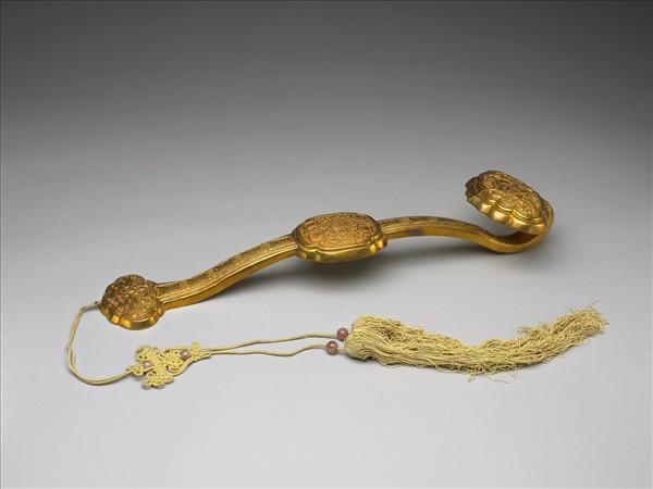 三鑲式金如意,正面紋飾分三部份:首面中央為一浮雕壽星,另有蝙蝠、鶴、鹿等浮雕,寓「福壽長春」之意。柄中央有「聖壽無疆」之賀詞。柄尾雕「福山壽海」圖案。下垂黃色絲帶編花雙穗,附淡紫碧璽圓珠。