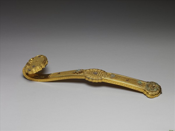 三鑲式金柄點翠如意,首趾均呈雲葉形,柄中部隆起,腹呈橢圓八瓣花形。首、柄、腹部分別以古錢紋、勾連紋、龜背紋為底;首部加飾蝙蝠,柄上以松石鑲嵌及點翠技法裝飾有蓮花紋及花籃紋,趾部則以點翠技法飾以變形花紋。如意背面以魚子紋為地,首背鏨刻庭石、菊花、蘭草,柄上部刻桃花及桃實,柄下部刻庭石、梅花及竹葉,趾背刻一折枝桃樹紋。